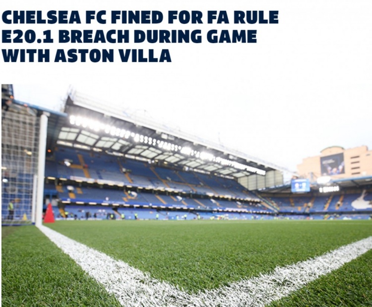 切尔西足球俱乐部因在2025年12月27日对阵阿斯顿维拉的英超比赛中违反英足总E20.1规则而受到处罚。